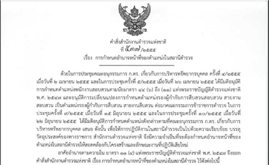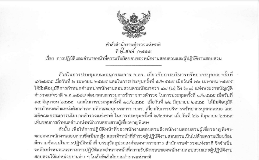 - คำสั่ง ตร.538/2555 : เรื่องการปฏิบัติและอำนาจหน้าที่ความรับผิดชอบของพนักงานสอบสวนและ ผู้ปฏิบัติงานสอบสวน